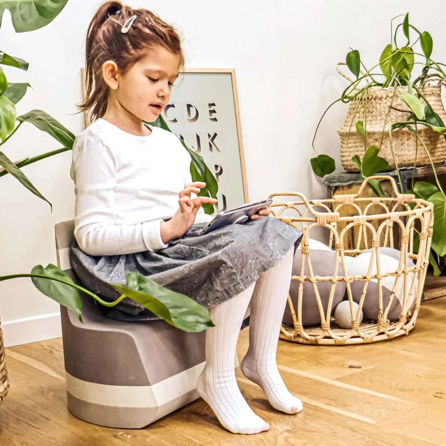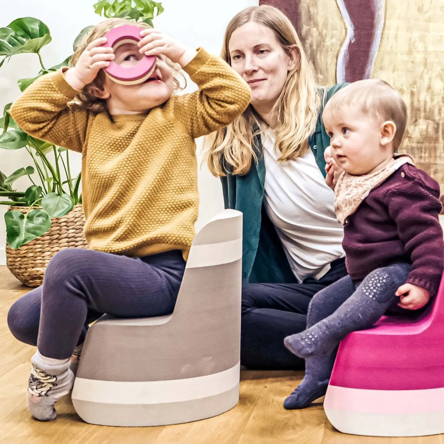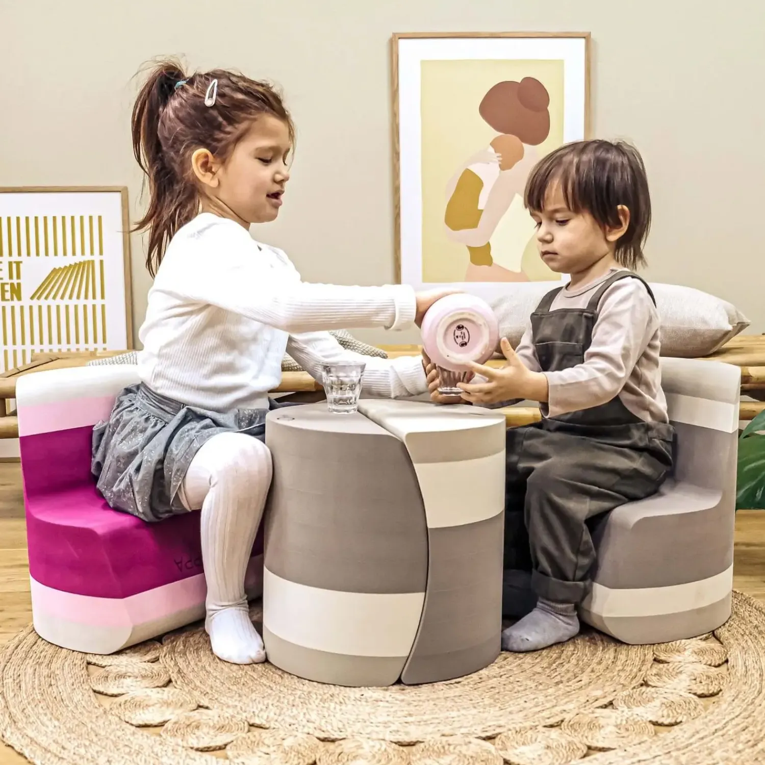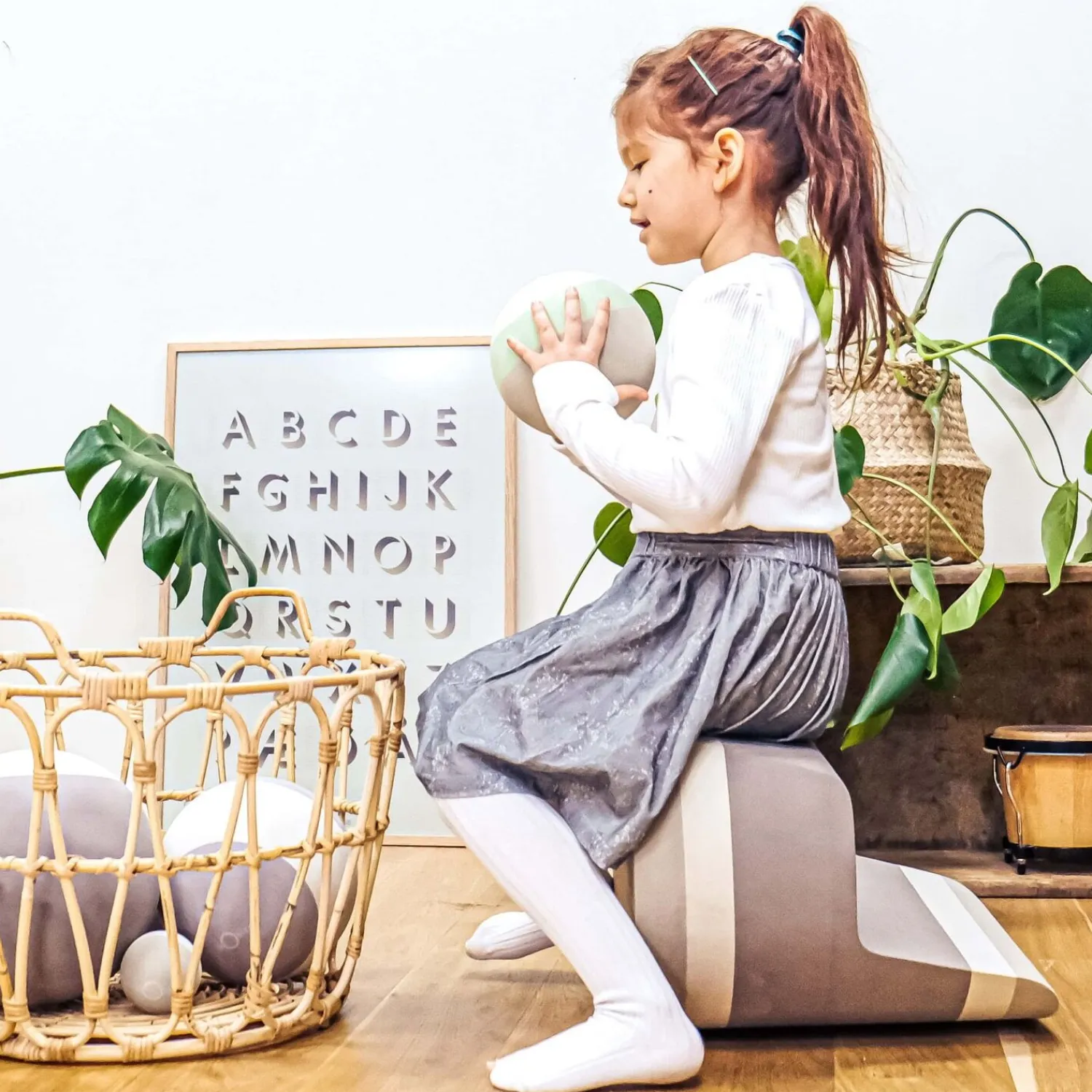 Stolen kan lægges på ryggen for at skabe en vippefunktion, som tilføjer en ekstra legemulighed. Du kan også sammensætte den med en anden Twin for at danne en cylinder. Designet pynter i hjemmet som en del af bObles cirkelserie, så den fungerer både som møbel og legetøj.
