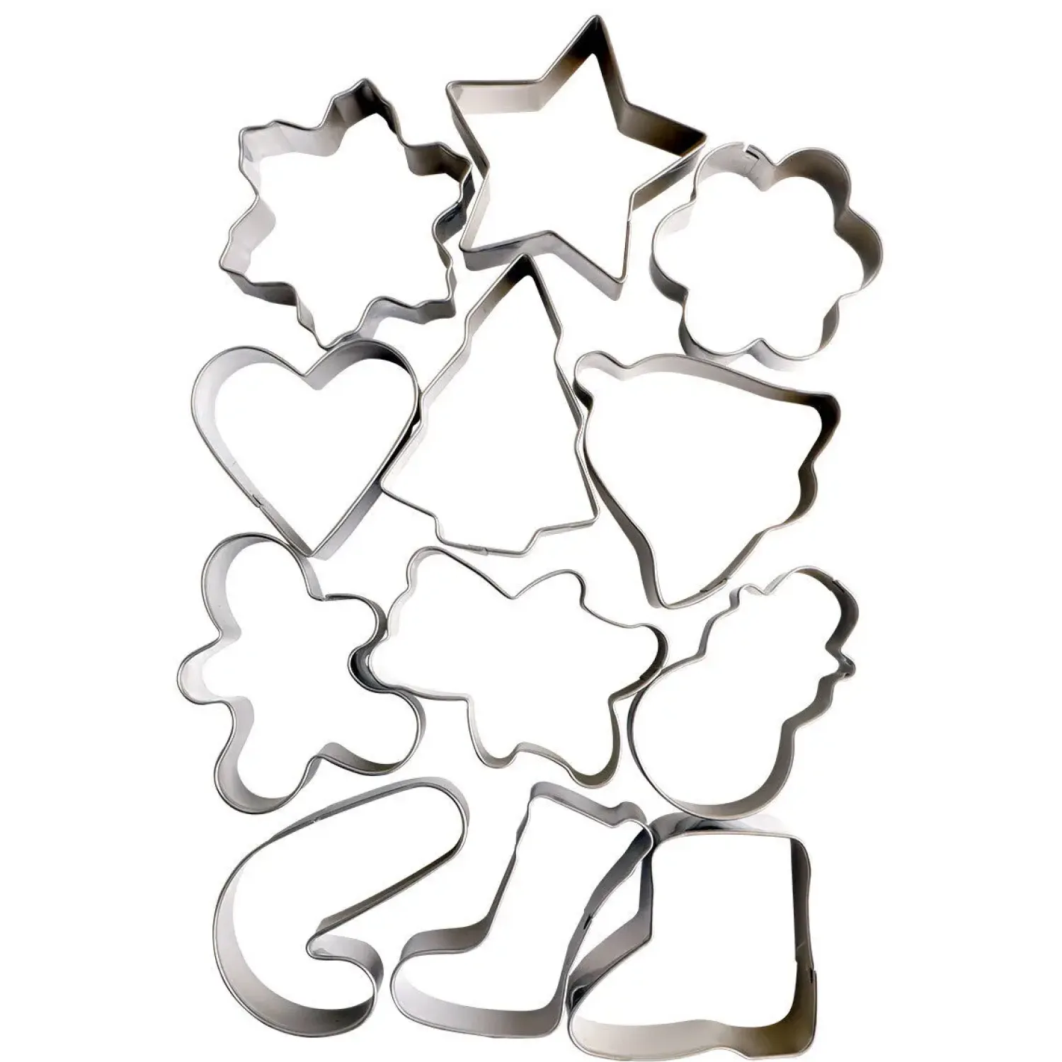 Skab julestemning i køkkenet med disse udstiksforme i rustfrit stål. Sættet indeholder 12 forskellige klassiske julemotiver til dine hjemmebagte småkager, fra stjerner og hjerter til juletræer. Det er ideelt til julebagning.