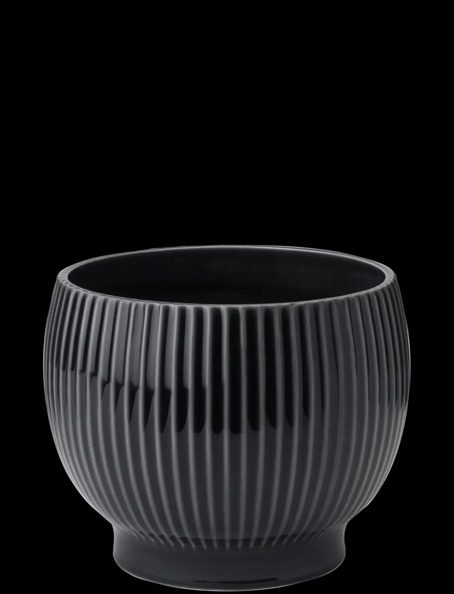 Denne urtepotteskjuler bevarer den originale formgivning fra 1940’erne, men er opdateret med en moderne, sort glasur. Den riflede overflade skaber et interessant spil af lys og skygge, fremhævet af den blanke finish.