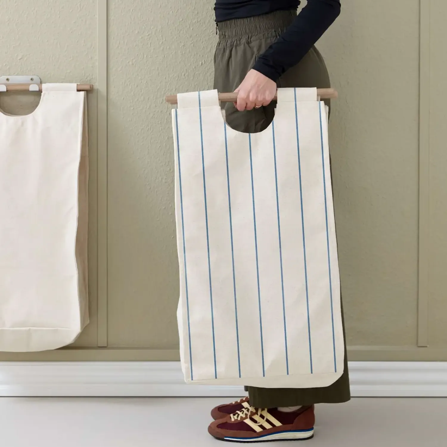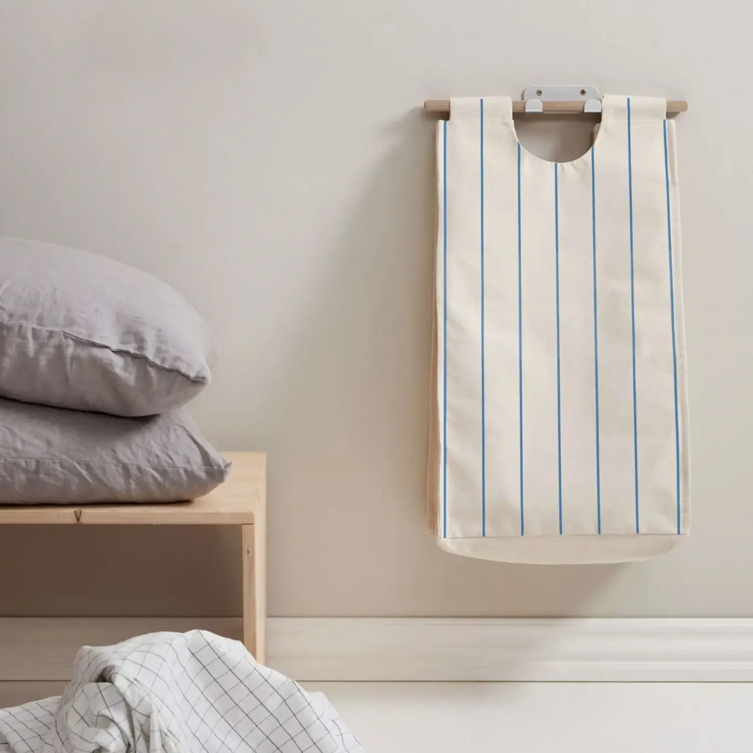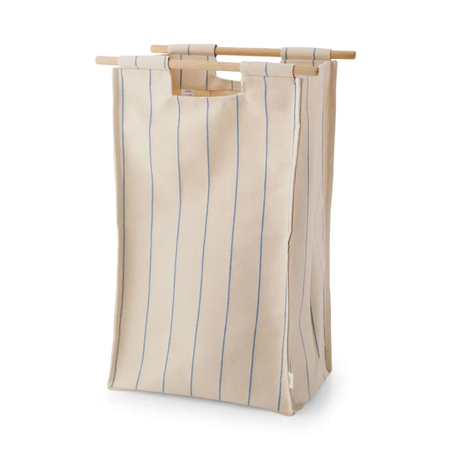Tekstilposen fås i tre forskellige varianter, så du kan tilpasse opbevaringsløsningen til din personlige stil: en klassisk natur, en natur med kastanjerøde striber, eller en natur med koboltblå striber. Uanset hvilken du vælger, giver denne løsning dig mulighed for at tilføje et stilfuldt element til din indretning. Med GOTS-certificeringen af tekstilposen kan du være sikker på, at materialet er fremstillet under bæredygtige og socialt ansvarlige forhold.