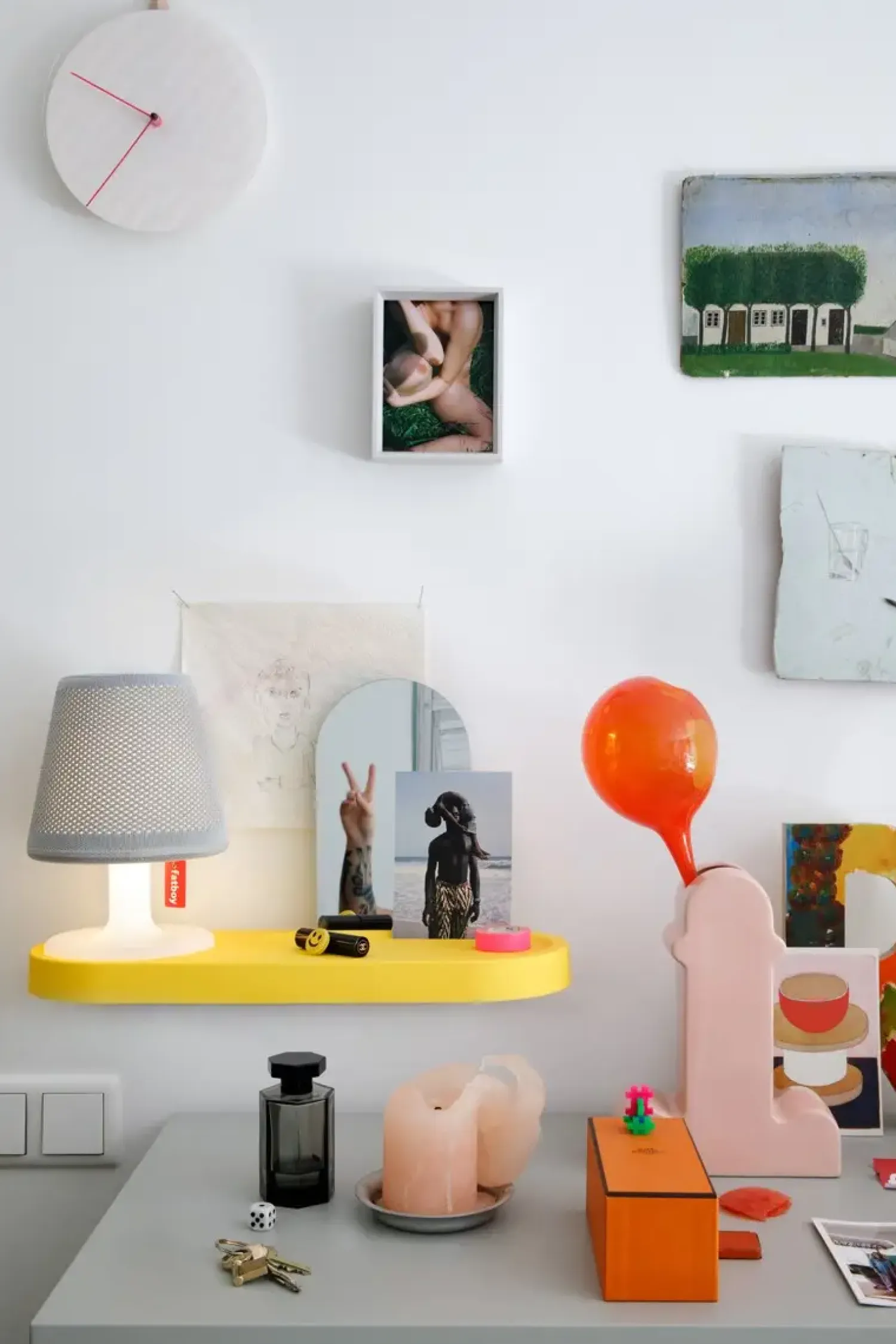 Denne væghylde kombinerer opbevaring med et funktionelt design. Det integrerede cirkulære rum og de opretstående kanter giver plads til dine ting, mens spejlet tilføjer en praktisk funktion. Hylden er specielt designet til at passe sammen med Fatboy Edison the Petit bordlampen, hvilket skaber en sammenhængende enhed.