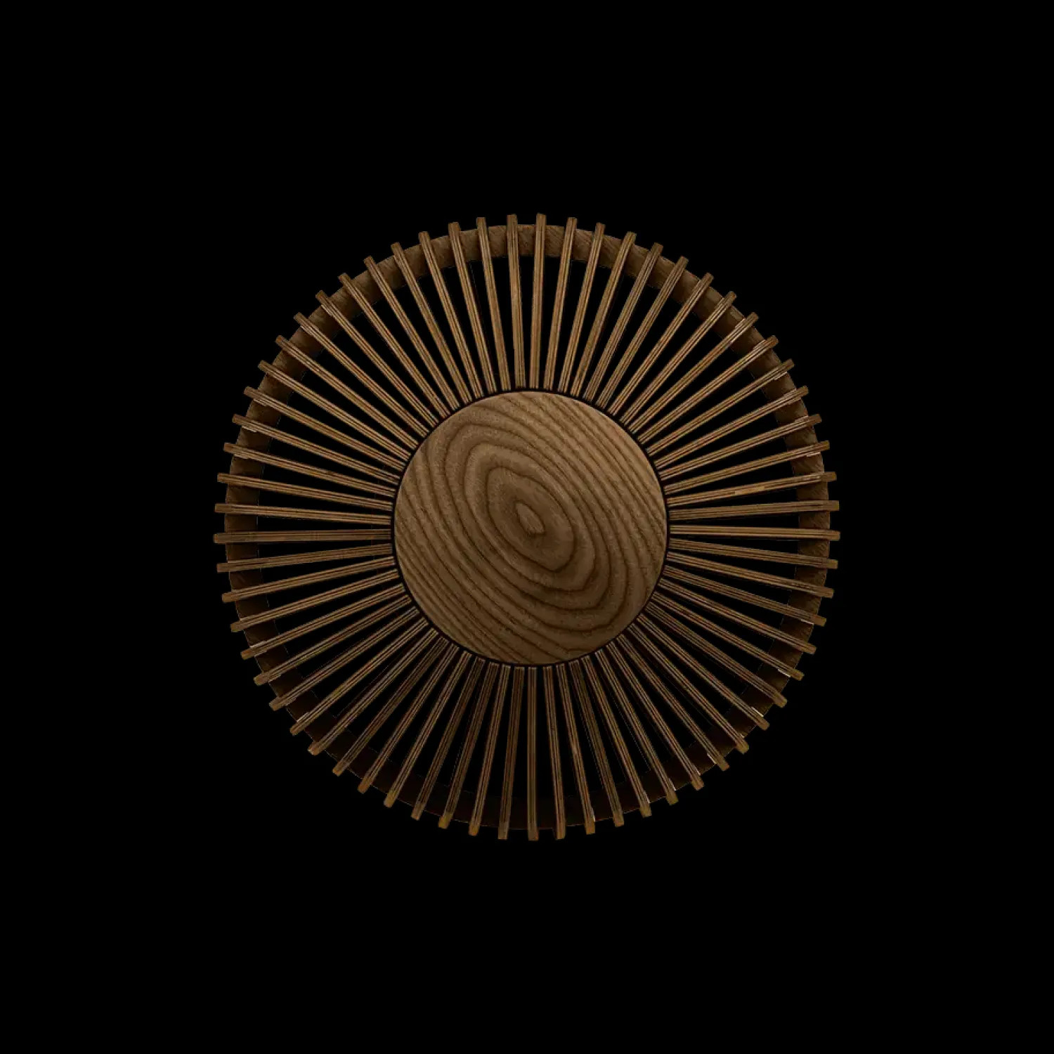 Dekorativ Umage Clava Up Wood væglampe, der er fremstillet af laserskårede trælameller. Væglampen skaber et legende lysspil på rummets vægge og giver en behagelig belysning. Lampen er designet med håndværksteknik, der kræver stor præcision pga. af den smalle afstand mellem trælamellerne.