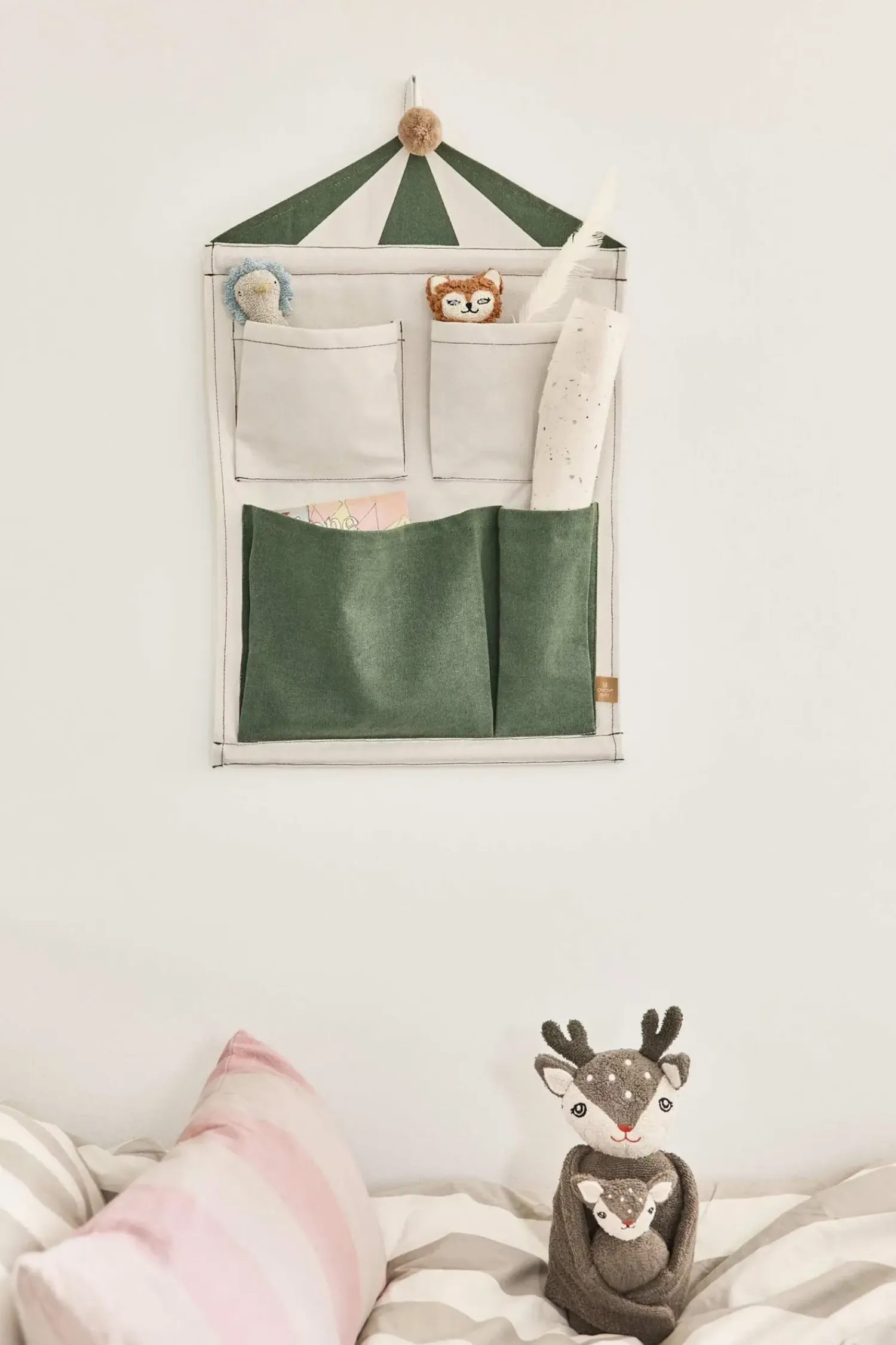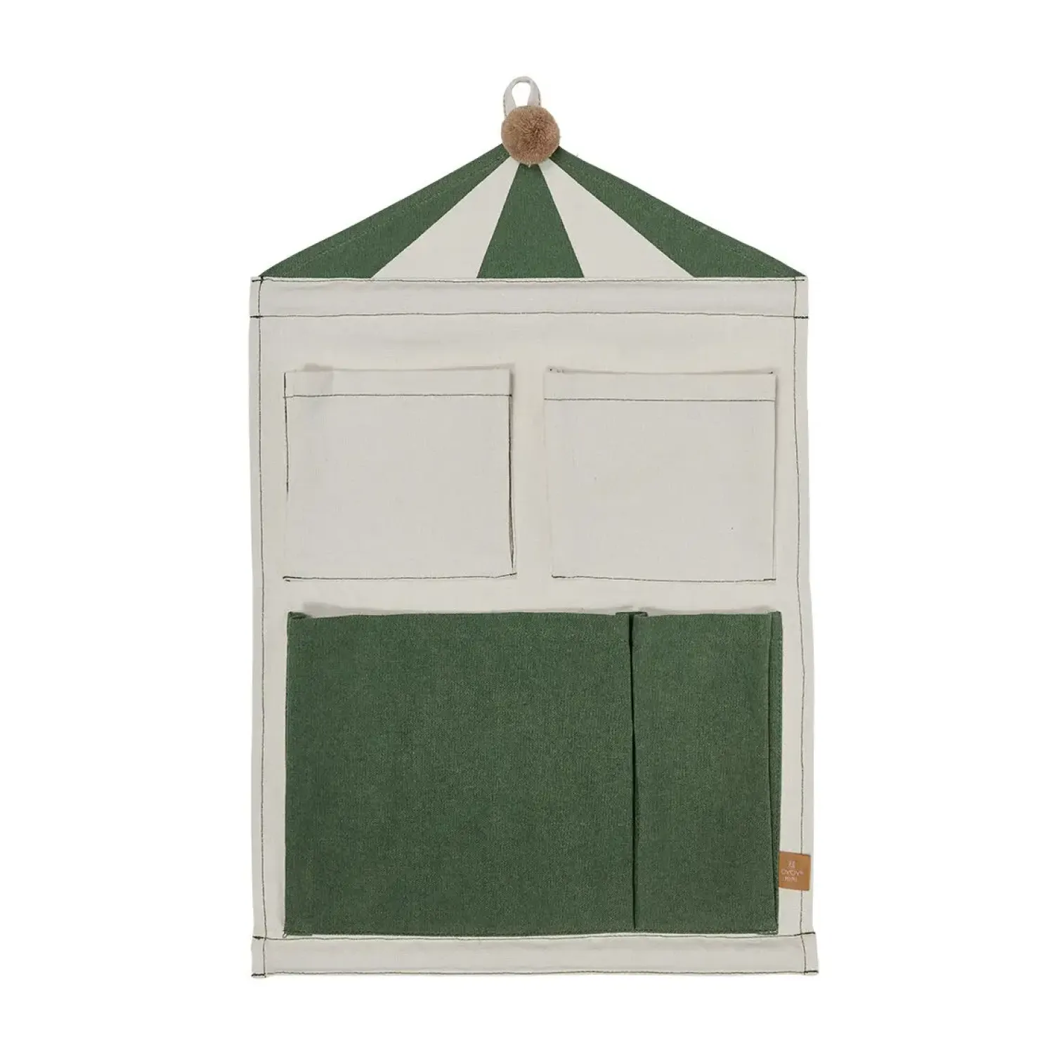 Det grøn- og hvidstribede design med den karakteristiske pompon på toppen tilfører et friskt præg til din væg. Organizeren passer særligt godt ind i rum, hvor du har brug for at kombinere praktisk opbevaring med et stilrent udtryk.
