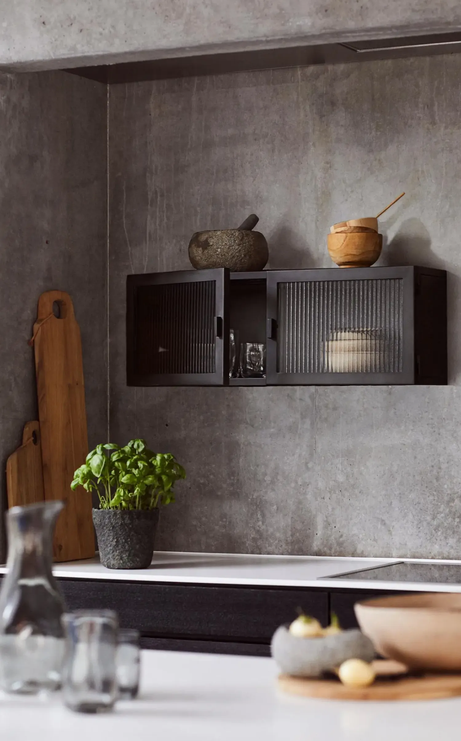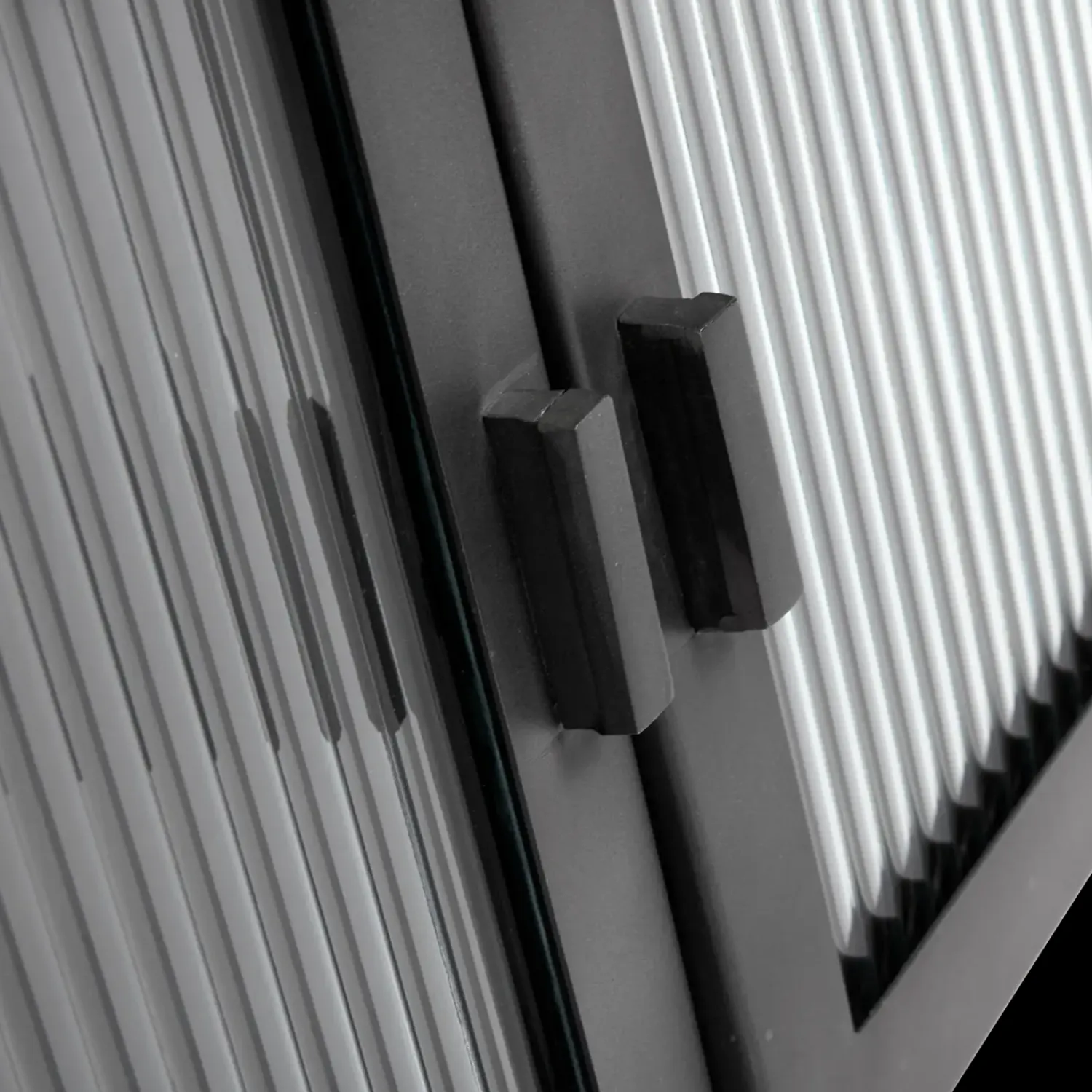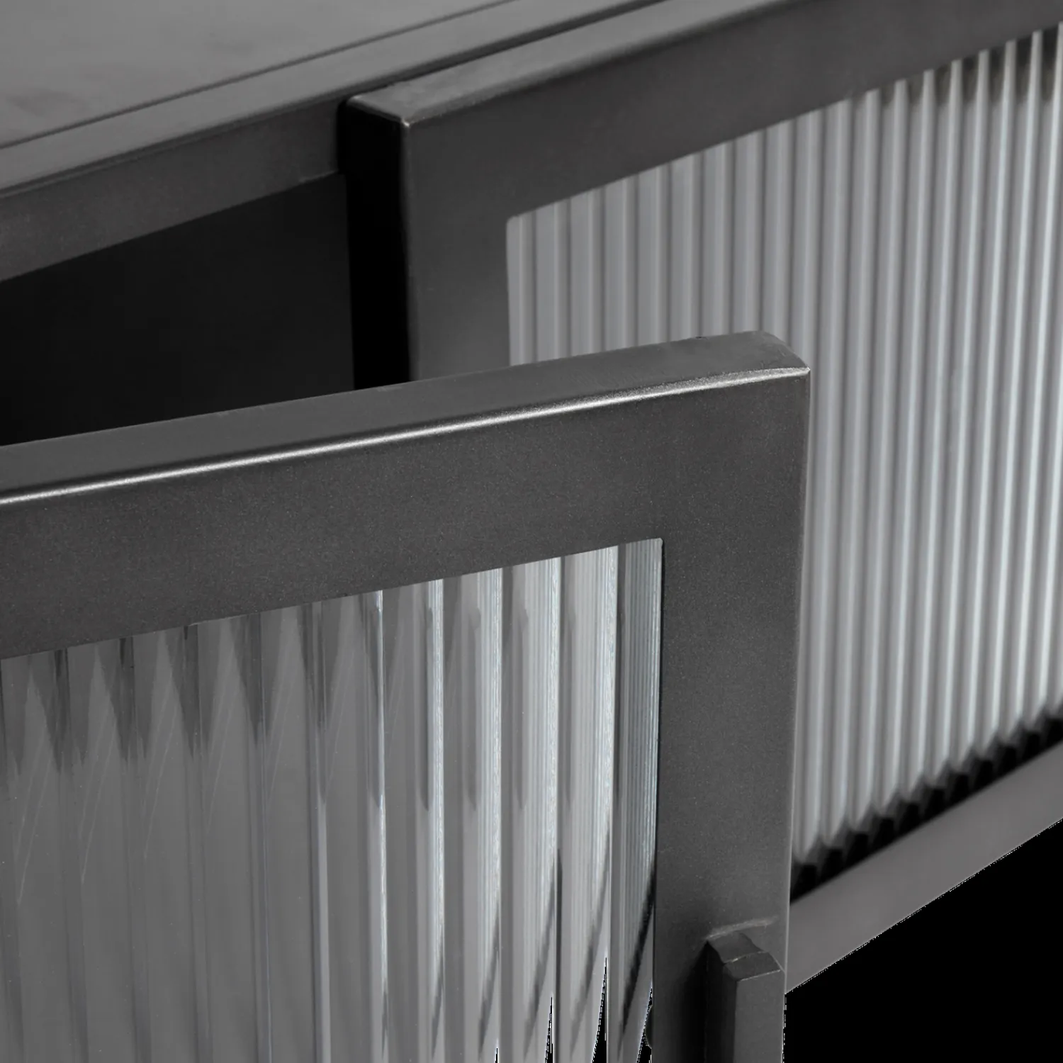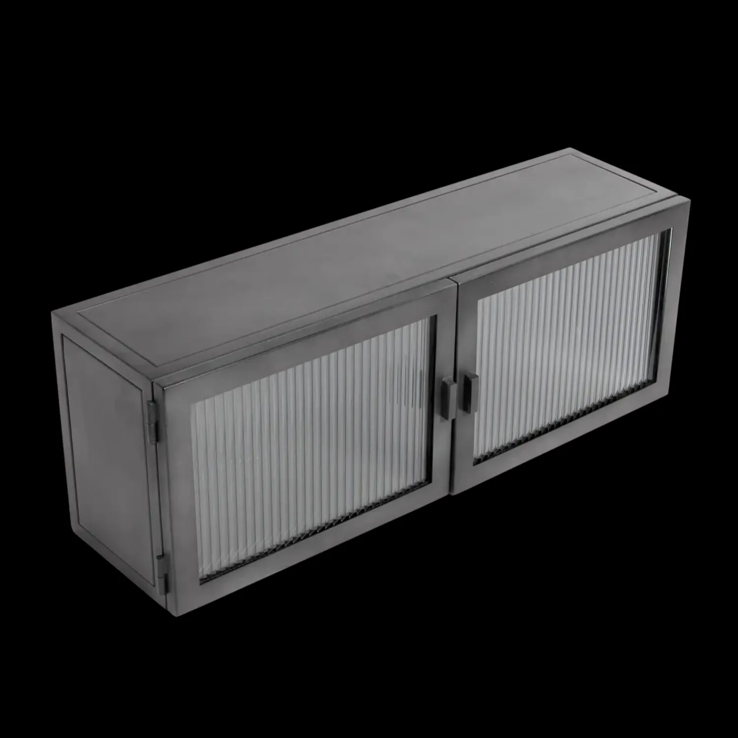 Det riflede glas i skabets låger skaber en interessant visuel effekt og giver et diskret indblik i skabets indhold. Den magnetiske lukkemekanisme sikrer nem og lydløs åbning og lukning. Skabets dimensioner gør det egnet til opbevaring af mindre genstande som porcelæn, bøger eller dekorative objekter.
