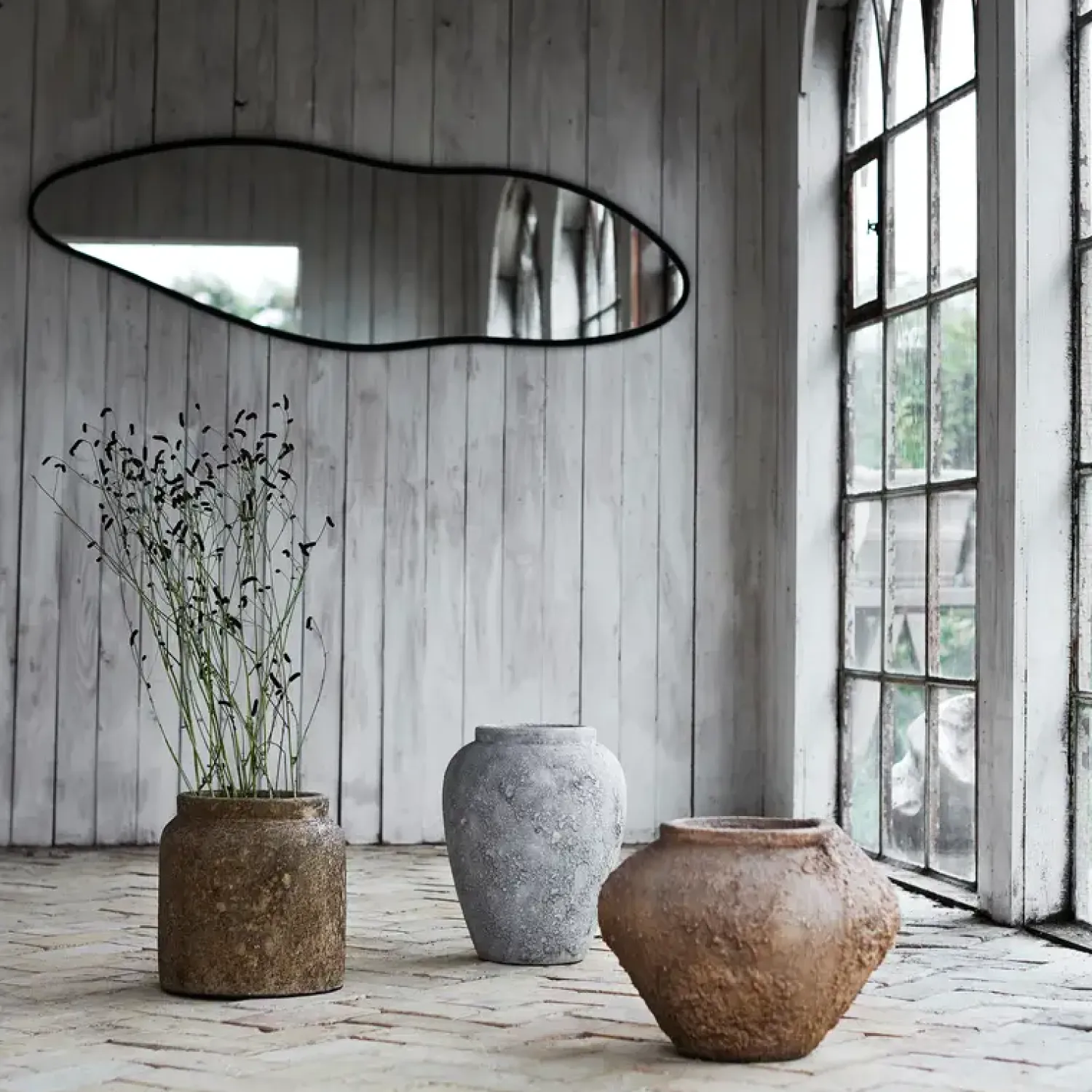 Spejlet inviterer til at lade flydende former berige indretningen, hvilket gør spejlet til et dekorativt vægelement. Spejlet kombinerer organiske former med et klassisk design i metalramme.