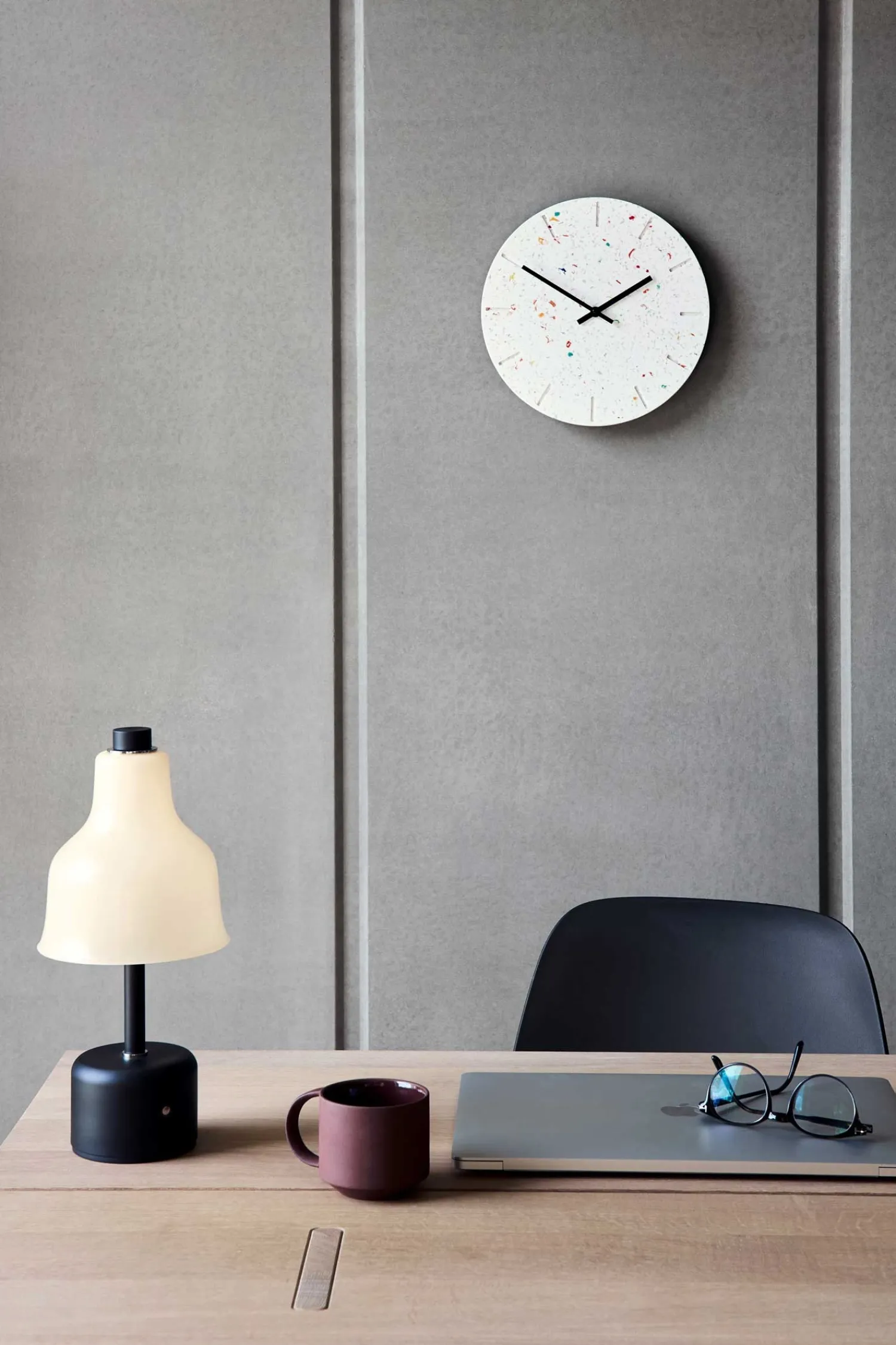 Dette vægur har en helt særlig finish fremstillet af genbrugsplast med farverige stænk, der tilfører et både legende og sofistikeret udtryk til ethvert rum. Urets enkle design understøttes af slanke visere i sort, som står i flot kontrast til den multifarvede baggrund.