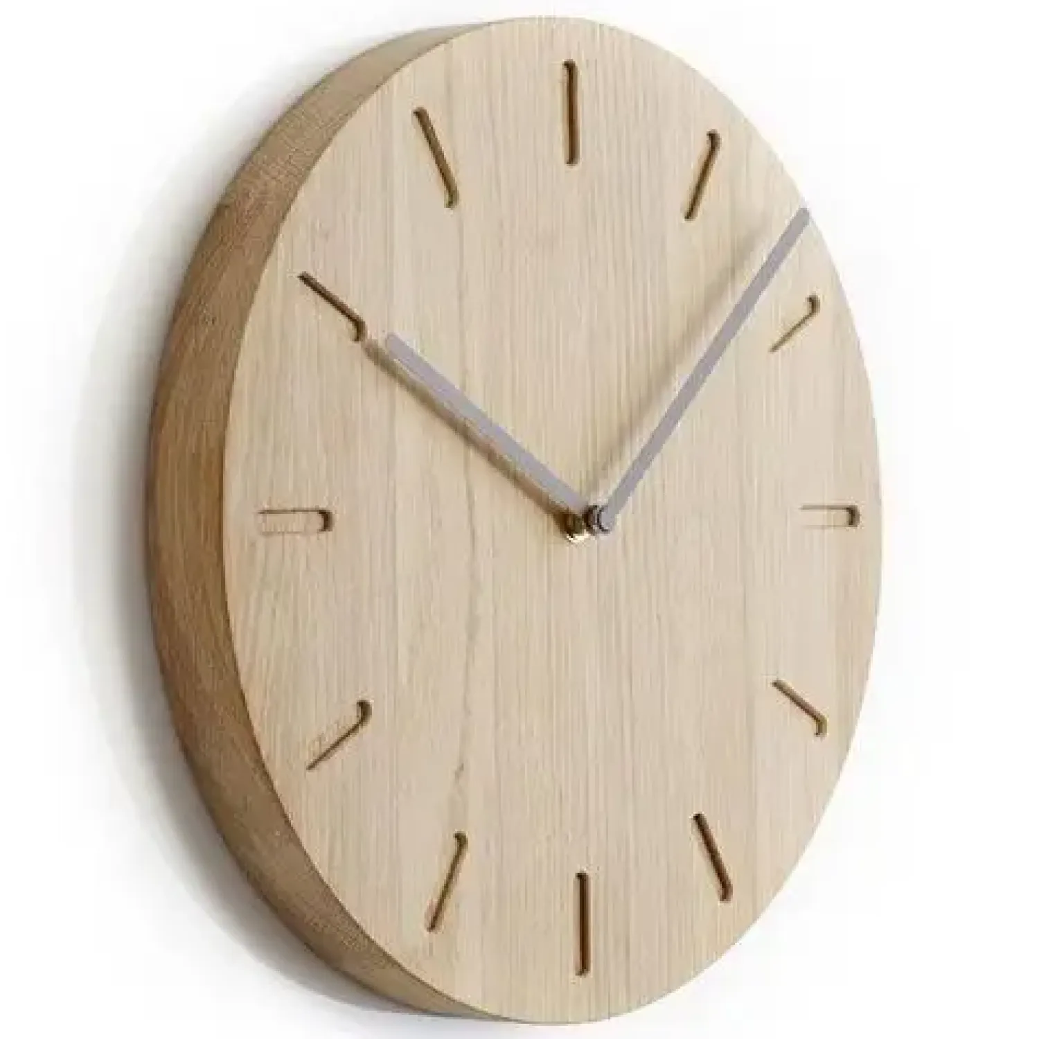 Det massive egetræ sikrer både holdbarhed og et klassisk udtryk. Træets naturlige årer og struktur giver hvert ur sit eget særpræg, mens de grå visere skaber en behagelig læsbarhed på den enkle urskive uden tal.