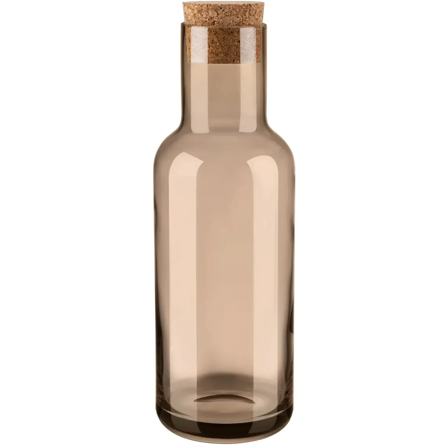 Denne vandkaraffel fra Blomus er fremstillet i mundblæst glas med en karakteristisk kaffefarvet nuance. Det cylindriske design med smalere hals giver karaflen et moderne udtryk, mens korklåget tilføjer et naturligt element. Med en kapacitet på 1 liter får du nok til flere glas.