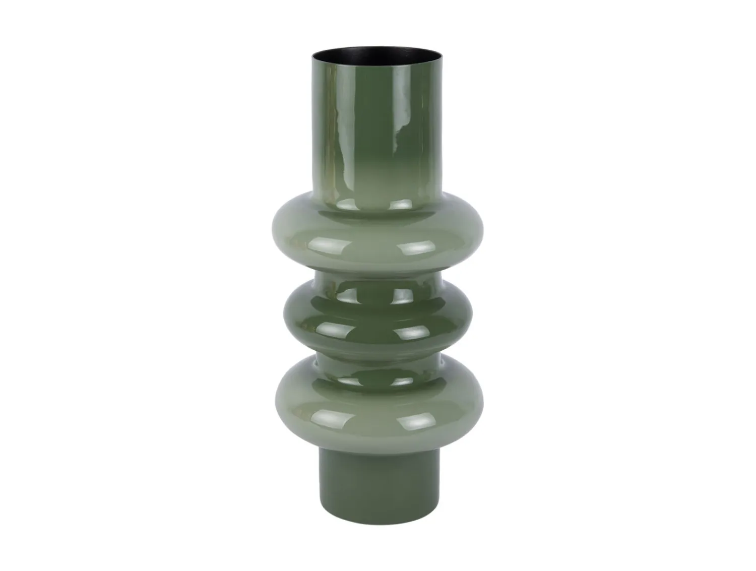 Jern som materiale giver vasen en robust konstruktion, der holder i mange år. Den grønne farve på jernoverfladen skaber en moderne kontrast til naturlige blomster og grønt. Vasens proportioner – 37 cm høj og 17,5 cm bred – gør den velegnet til både store og små rum, hvor du ønsker at tilføje et dekorativt element.