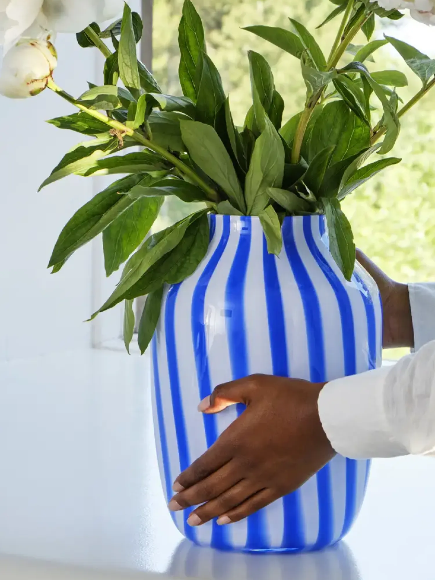 Denne blå Juice-vase fra Hay har en bulbet form med striber i blå og hvid. Med en højde på 28 cm og en bredde på 20 cm giver vasen plads til forskellige blomsterarrangementer.