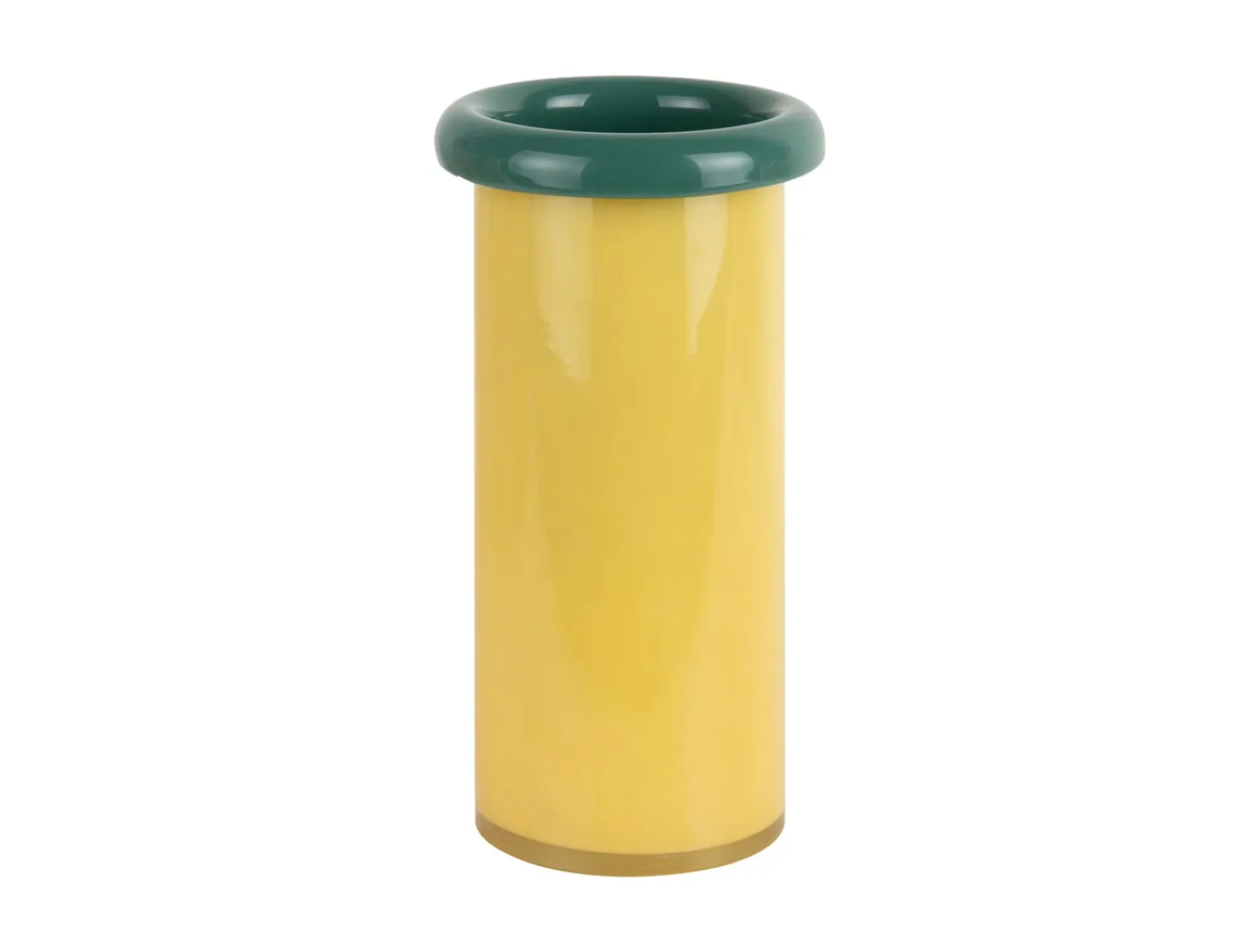Denne vase bringer farve ind i dit hjem med sin bløde gule krop og retrogrønne kant. Lavet af glas giver den en glat overflade, der passer ind i mange forskellige indretningsstile. Den cylindriske form skaber en visuel kontrast mellem den varme gule farve og den markante grønne kant øverst.