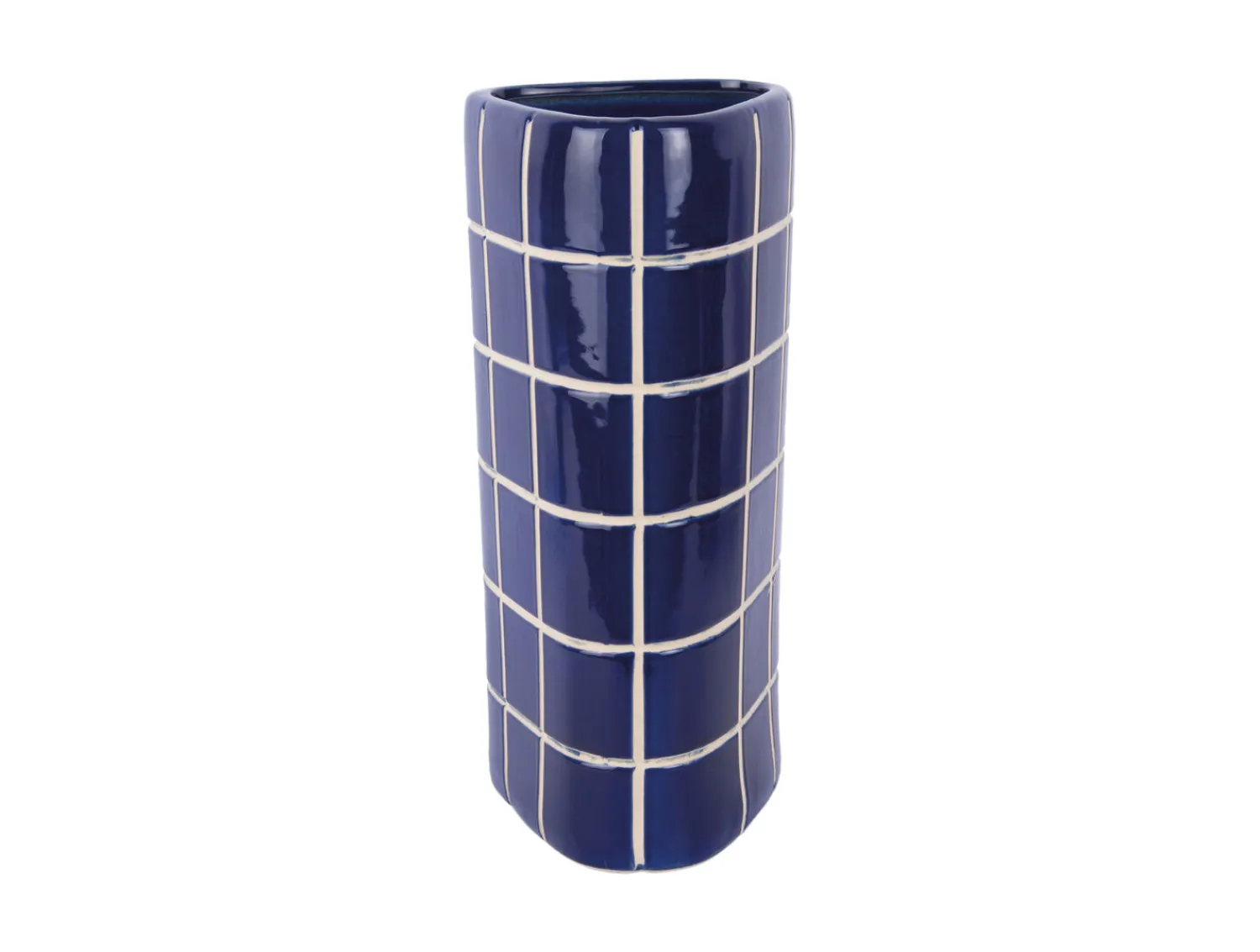Denne vase i koboltblå keramik har et markant gittermønster med hvide linjer, der skaber en fliseeffekt. Materialet er holdbart og giver vasen en blank finish. Med sin cylinderform passer den til både enkelte blomster og større buketter.