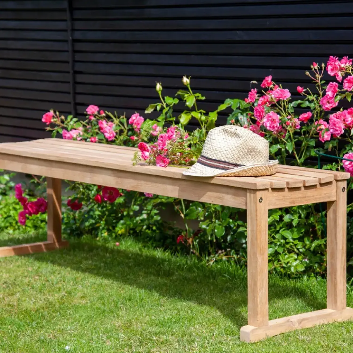Vega bænken er lavet af teaktræ, et materiale berømt for sine naturlige egenskaber. Bænkens design har et vandret sæde understøttet af ben i hver ende, hvilket giver den en simpel og lige form. Teaktræets naturlige farve og årer tilføjer til bænkens æstetik.