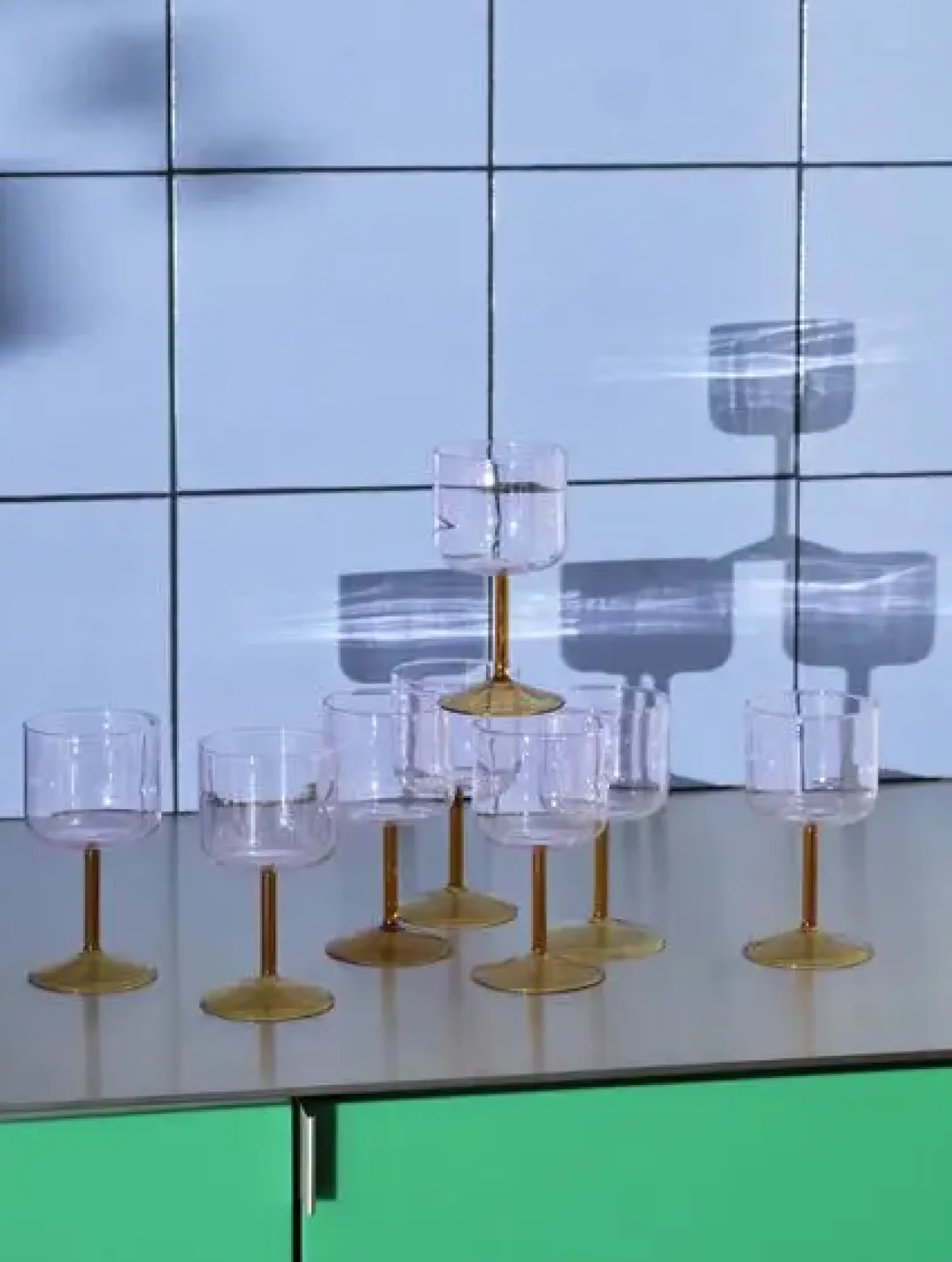 Dette sæt af to vinglas fra HAY kombinerer holdbart borosilikatglas med et særpræget farvevalg. Den lyserøde kopdel møder en gul stilk og fod, hvilket giver dit bord et personligt udtryk.
