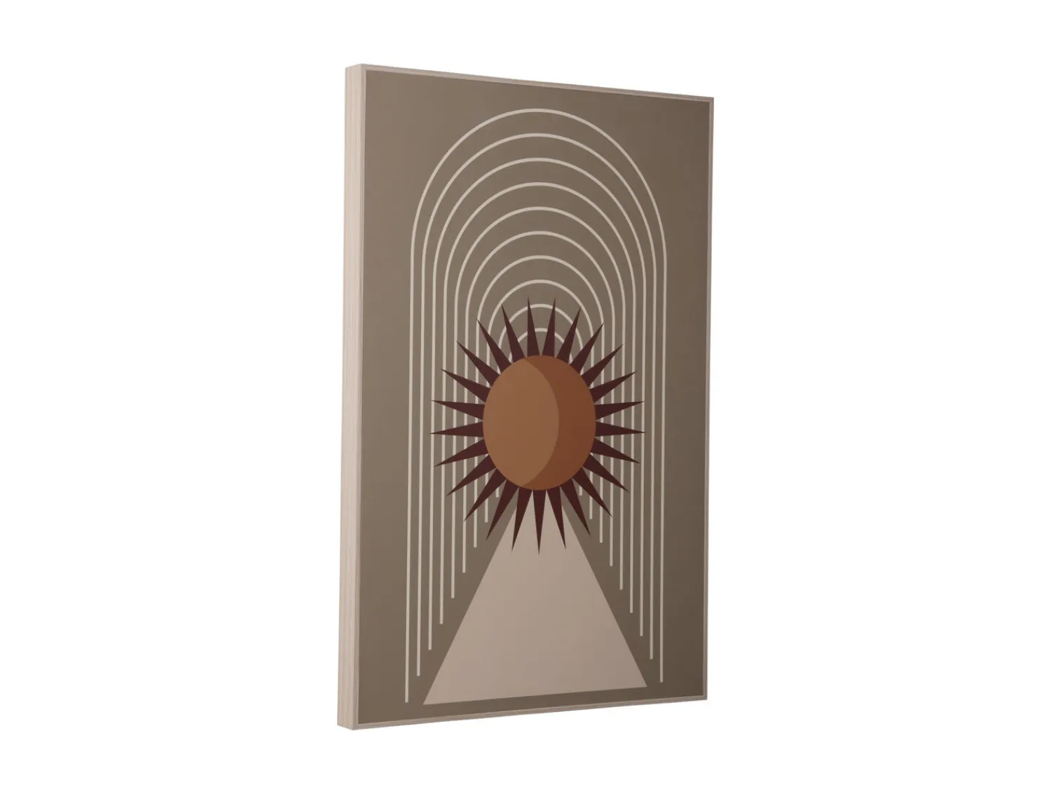 Vægkunst Arco Sol måler 60 cm i højden og 40 cm i bredden – dimensioner der gør det nemt at finde plads til den i forskellige rum. Den er fremstillet af MDF og har en dybde på 3 cm, hvilket giver en subtil dimensionel effekt på væggen uden at fylde for meget.