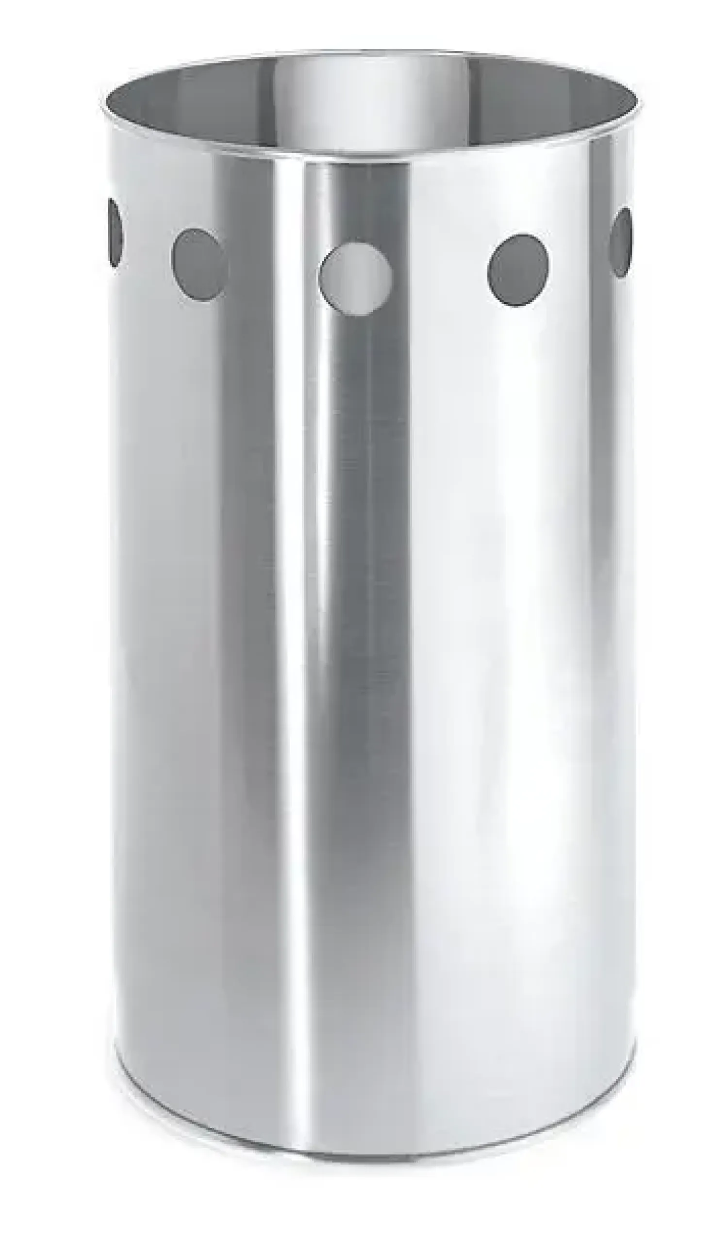 Papirkurven har et perforeret mønster og en plastindsats i bunden.