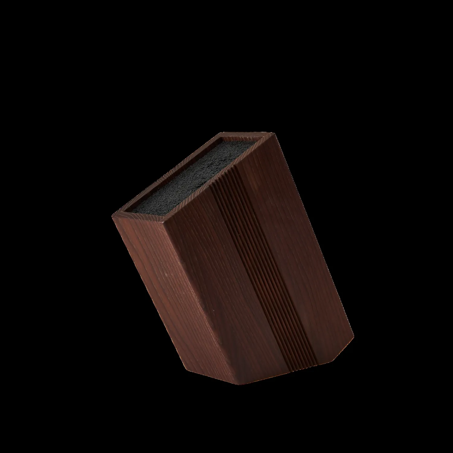 Knivblokken fra Yami serien er fremstillet af karboniseret asketræ, hvilket giver den karakteristiske mørke farve, der ikonisk for serien. Knivblokken er udformet med subtile detaljer og elegante riller, som skaber en let og raffineret kontrast til det mørke træ.Yami serien er inspireret af Japan og den er særdeles smuk at kombinere med et lyst stentøj eller marmor i køkkenindretningen. Knivblokken et elegant og funktionelt element til køkkenet, der passer godt på dine køkkenknive, og samtidig bringer stil ind i indretningen. Knivene placeres i beskyttende plastikstrå i knivblokken. Der er plads til 6-8 knive i knivblokken. Vi anbefaler at knivene placeres jævnt fordelt i knivblokken.Den brændte duft fra det karboniserede asketræ vil mindskes ved brug.